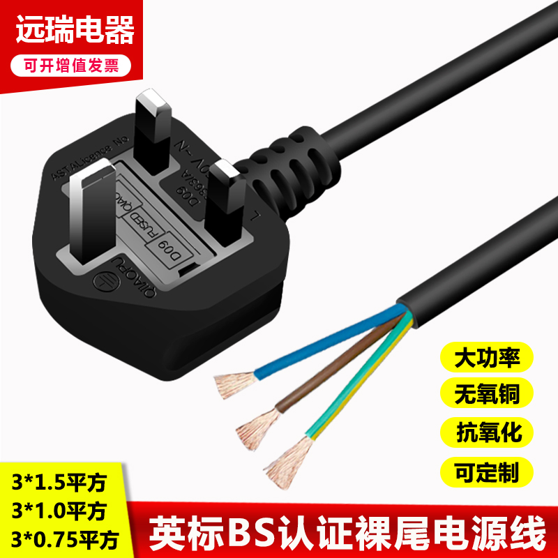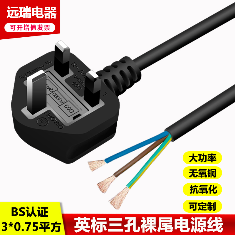 English Gauge BS Certified Power Cord Three Holes Pure Copper Bare Wire Tail 3 Cores 0 75 1 5 Squared 1 8 m Inform Plug Line