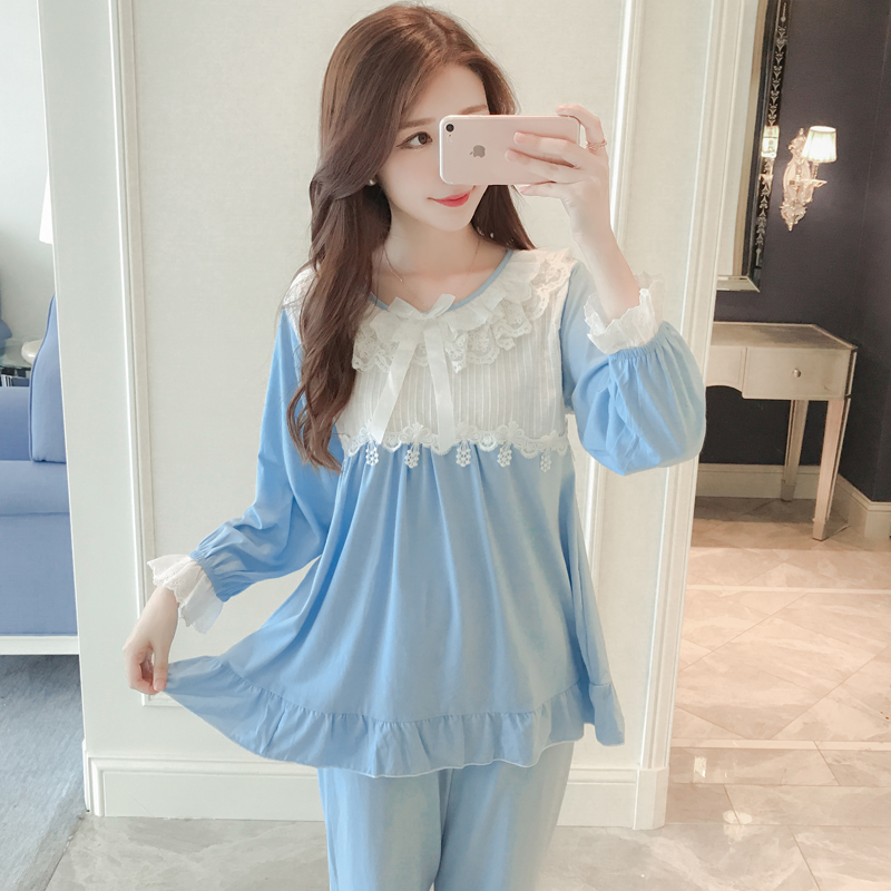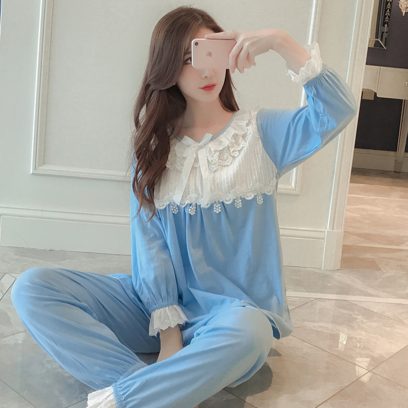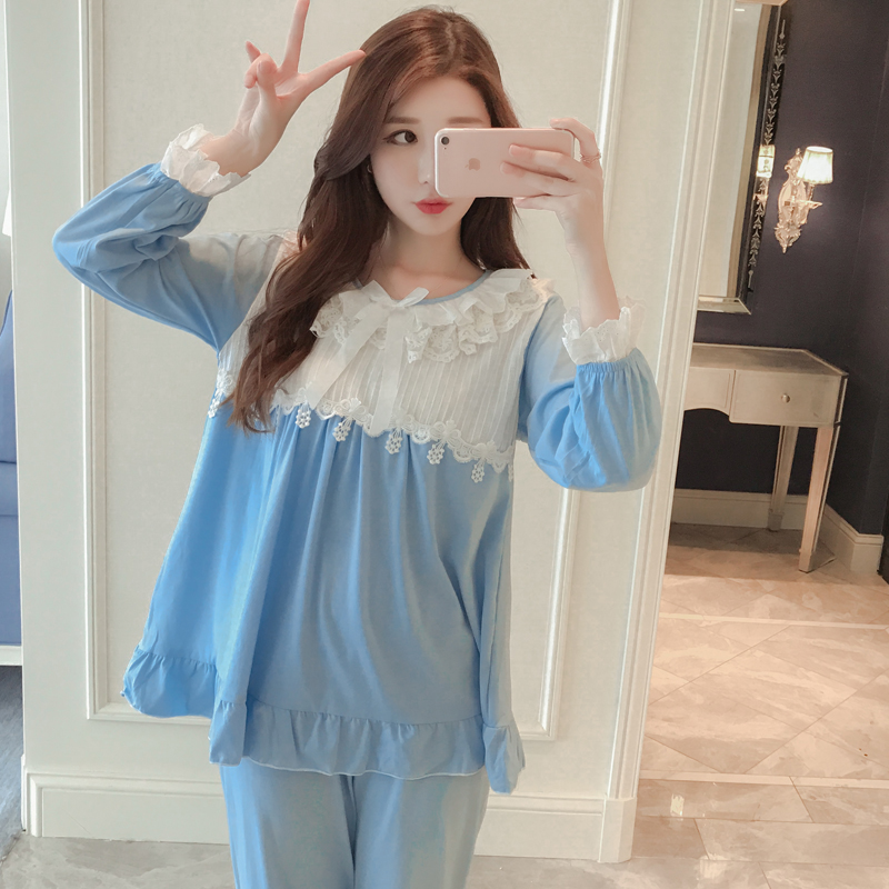 Pajamas women's pure cotton spring and autumn long-sleeved cute Korean version Lace home dress Summer princess fresh two-piece suit