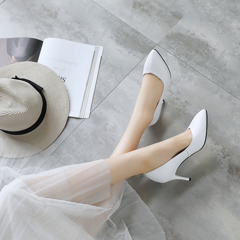 Spring and autumn single shoes women's pointed toe shallow mouth genuine leather shoes stiletto all-match white work women's shoes comfortable full leather high heels
