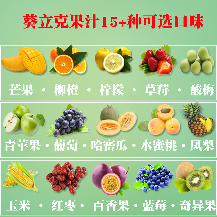 Blueberries 19 litres of red dates 19 litres of grapes 19 litres of peaches 19 litres of green apples 19 litres of lemon flavor 19 litres of cantaloupe 19 litres of grass