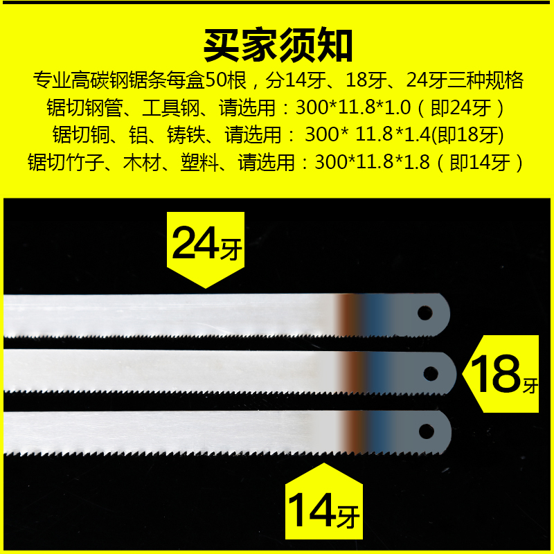 High carbon steel - saw blade in the middle teeth 18 teeth (14) high carbon steel - saw blade coarse teeth 14 teeth (a box of 50) high carbon steel - saw blade in the middle teeth 18 teeth (a box of 50 sticks) high carbon steel - saw blade fine teeth 24 teeth (a box of 50 sticks) (alone) steel saw frame (one) high carbon steel - mix and match the number of messages (50 pieces) high carbon steel - saw blade coarse teeth 14 teeth (14 pieces) high carbon steel - saw blade fine teeth 24 teeth (14 pieces) steel saw rack (1) + high carbon steel - coarse teeth 14 teeth (6) steel saw rack (1) + High Carbon Steel - Medium Tooth 18 Teeth (6 sticks) Hacksaw Rack (1 piece) + High Carbon Steel - Thin Tooth 24 Teeth (6 sticks) Thick Teeth 14 teeth (50 sticks in a box) - Flexible Model Medium Tooth 18 teeth (50 sticks in a box) - Flexible Model Thin Teeth 24 Teeth (50 sticks in a box) - Flexible Model Flexible Style - Thick Teeth 14 Teeth (14 sticks) Flexible Model - Medium Tooth 18 Teeth (14 sticks) Flexible Model - Thin Teeth 24 Teeth (14 sticks) Flexible Model - Mix and Match The number of messages (50 sticks) Hacksaw Rack (1 piece) + Flexible Model - Coarse Tooth 14 Tooth Steel Saw Blade (6 pieces) Hacksaw rack (1pcs) + Flexible - Medium Tooth 18 Tooth Saw Blade (6 pieces) Hacksaw Rack (1 piece) + Flexible Model - Thin Tooth 24 Tooth Saw Blade (6 pieces) Double-sided Widened Saw Blade (10 pieces)