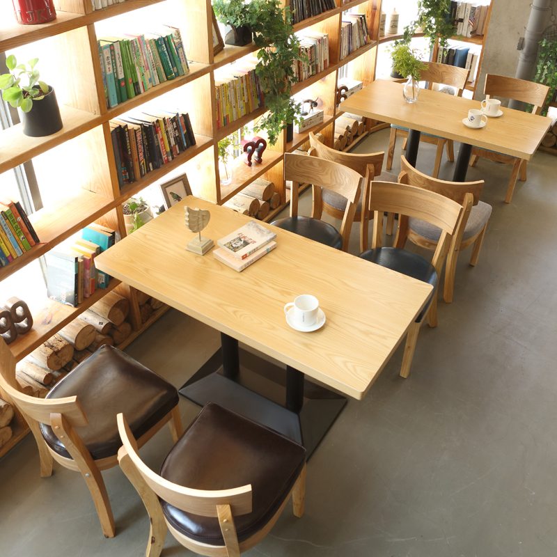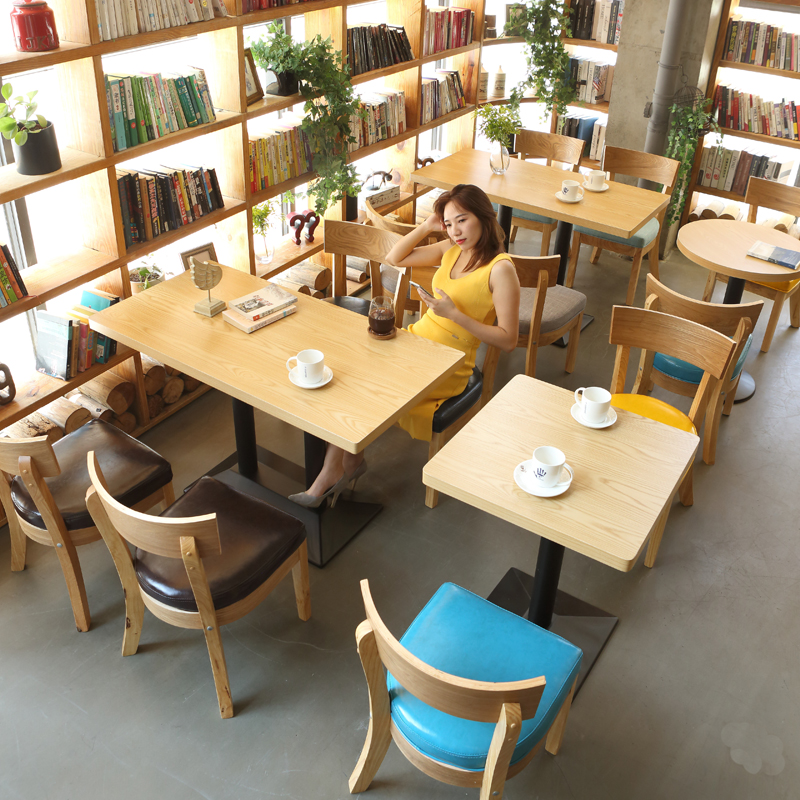 Dark coffee leather chair log color 60*60*75 square table yellow leather chair light blue cloth chair sky blue chair diameter 60 round table log color 120*60*75 long table dark blue leather chair light gray