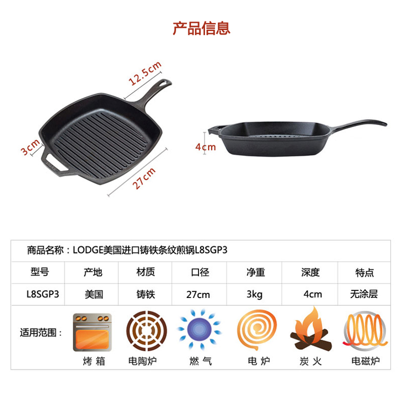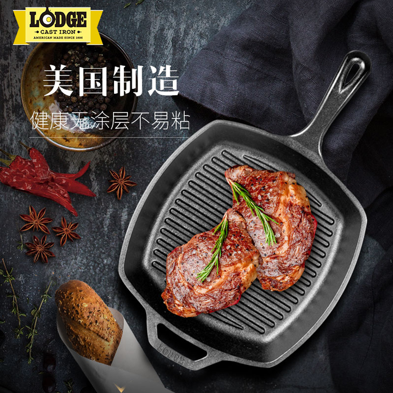Lodge Lo Cast Iron Steak Bottle Household square striped frying pan General coating is not easy to stick