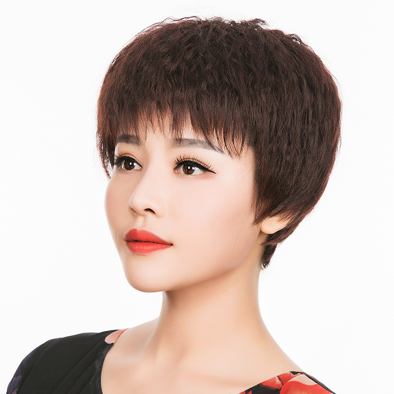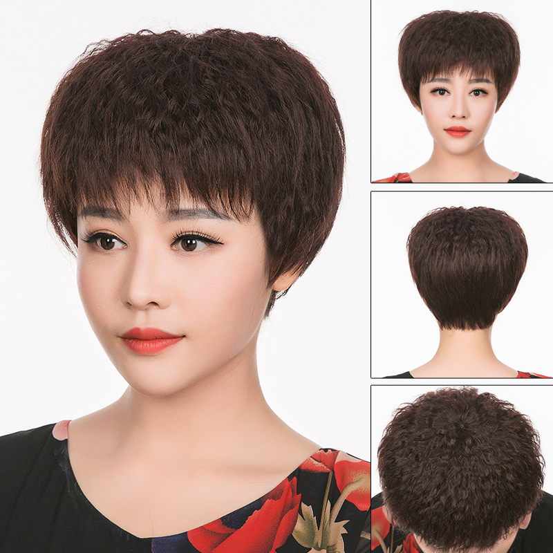 Wig female short hair Real hair middle-aged mother wig female fluffy BOBO head short roll corn perm type