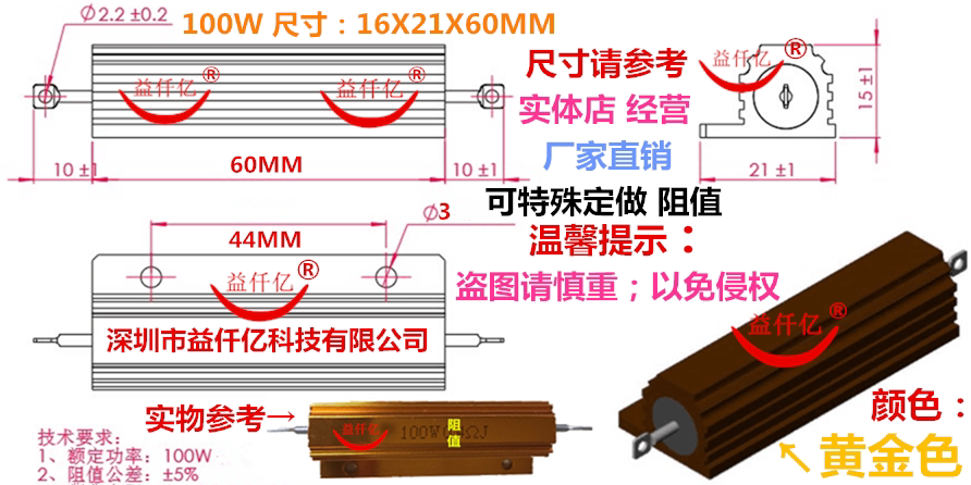 Yellow metal shell aluminum shell resistance RX24-100W 10R 10 ohm 10Ω high power cooling resistance 5%