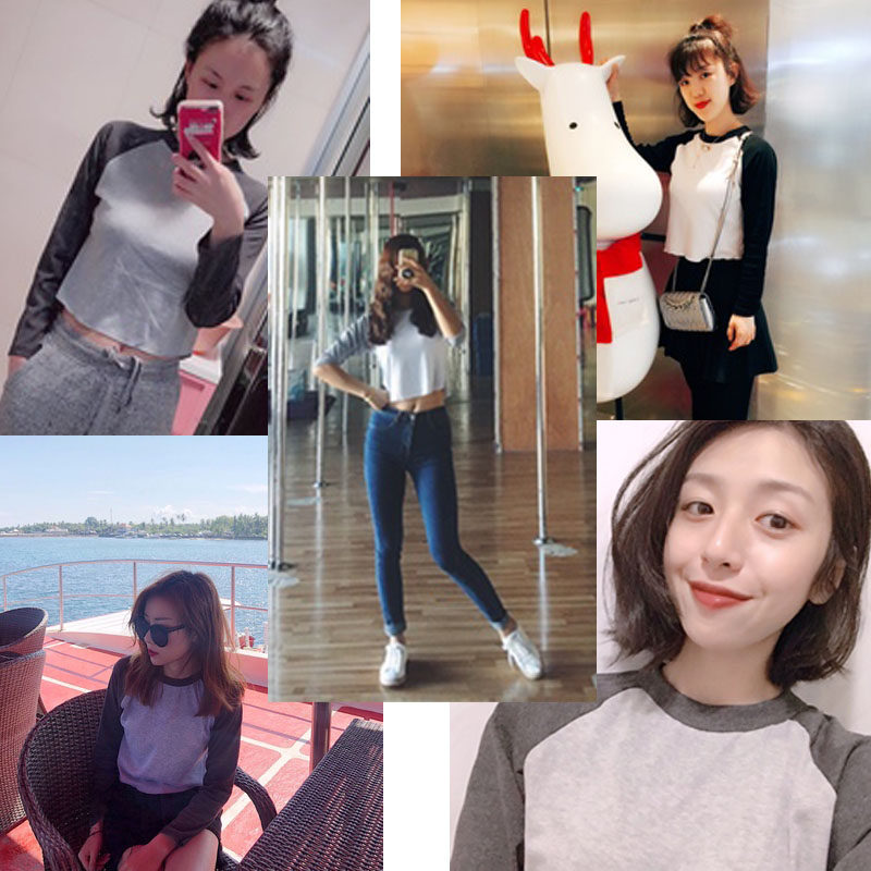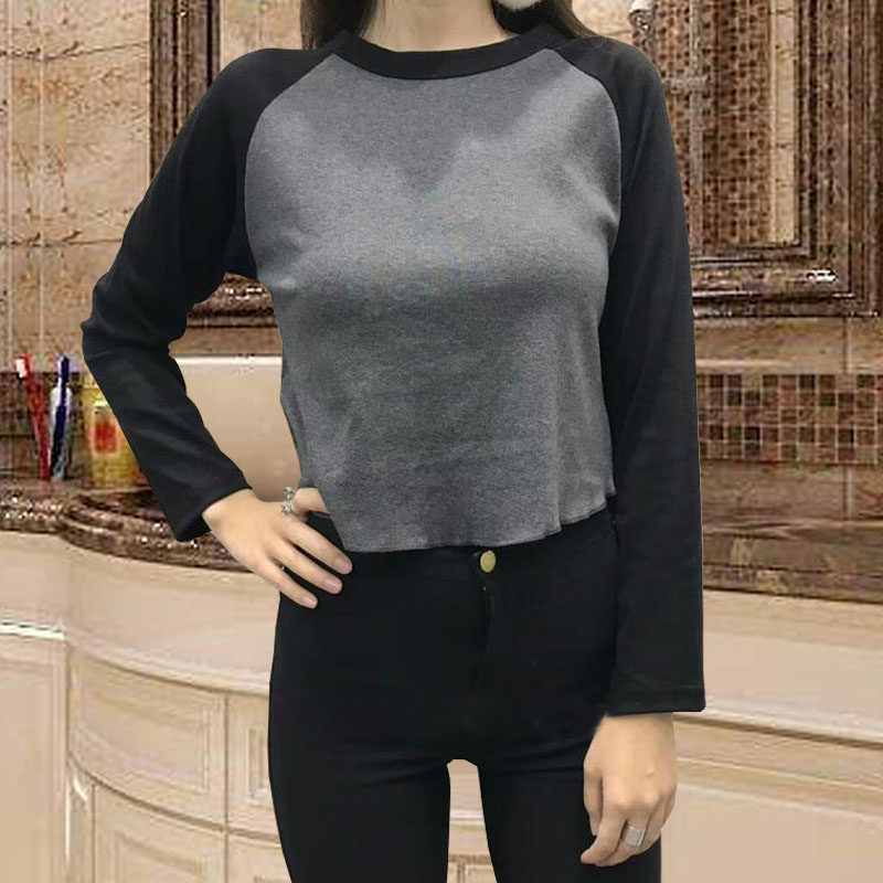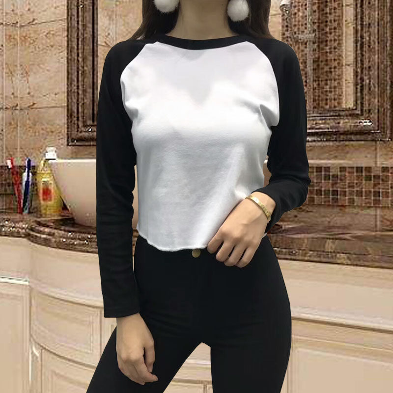Early autumn new American round neck exposed navel high waist T-shirt hit color long-sleeved navel leakage short baseball uniform small shirt yoga women