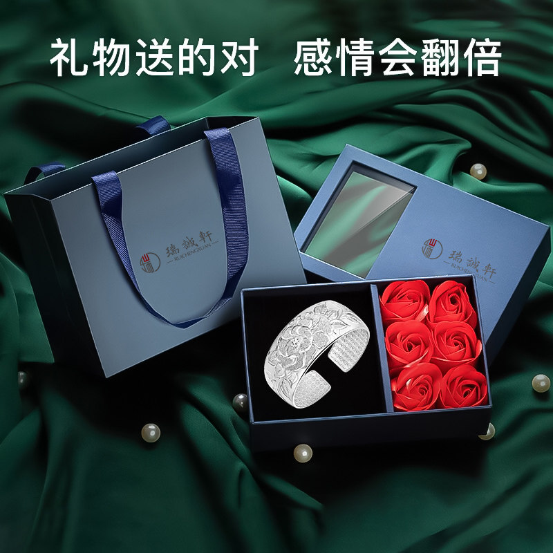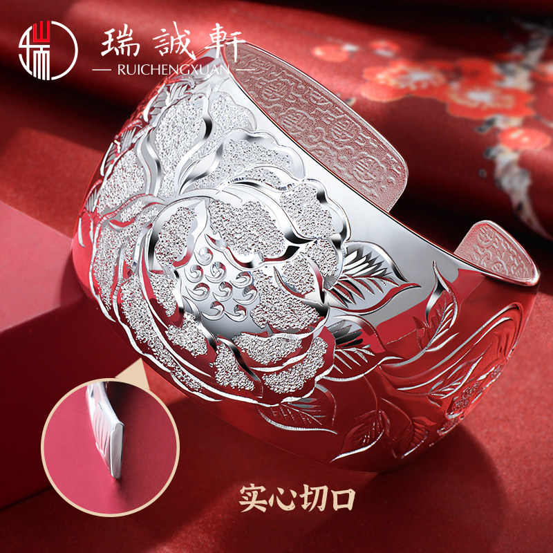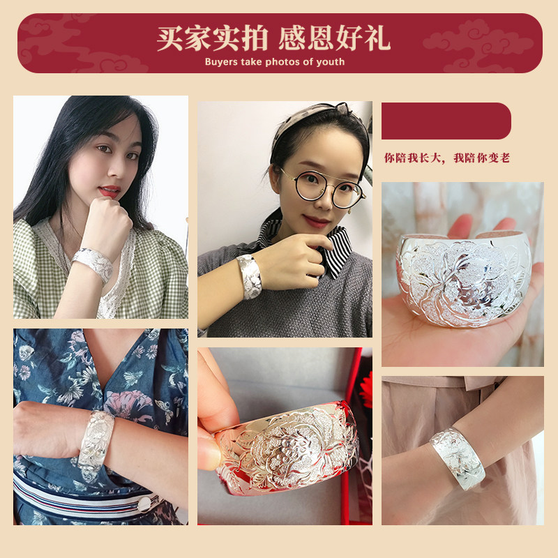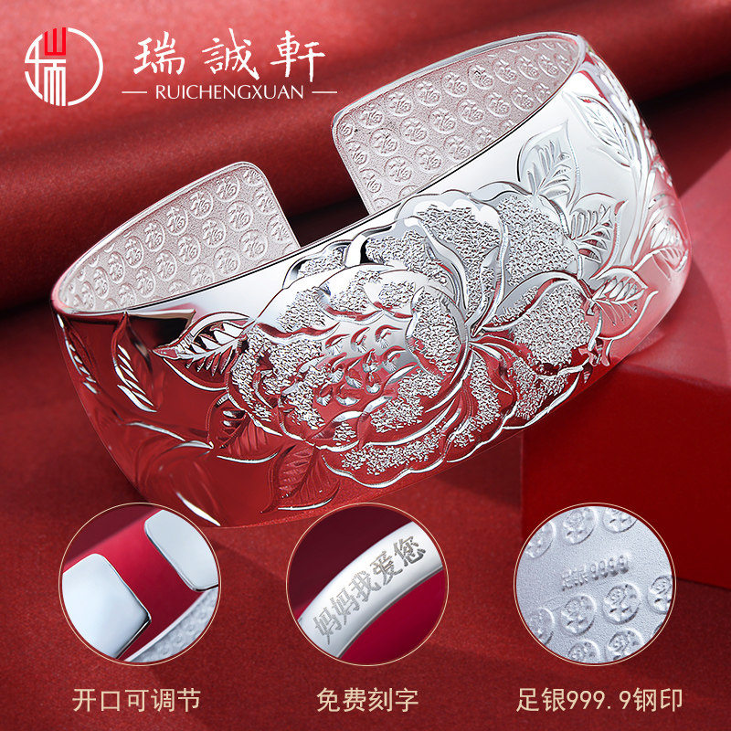 Silver bracelet woman pure silver 9999 fugui peony opening wide face foot silver bracelet for Mother's Day birthday present