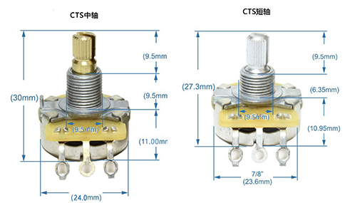 A 50k short shaft, a 250k short shaft, a 250k no load through short shaft, a 500k middle shaft, a 1meg 1000k short shaft
