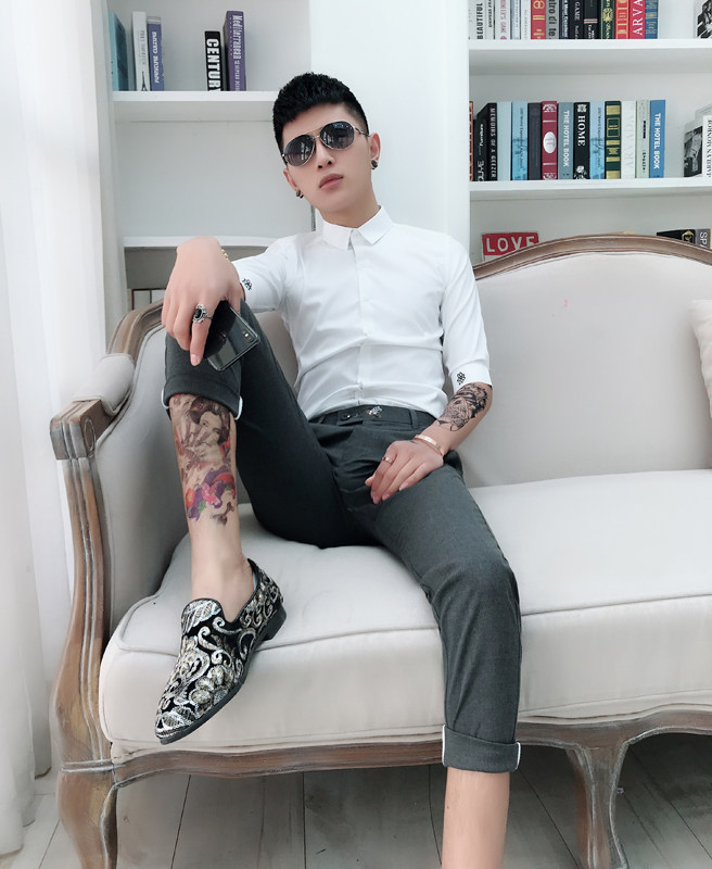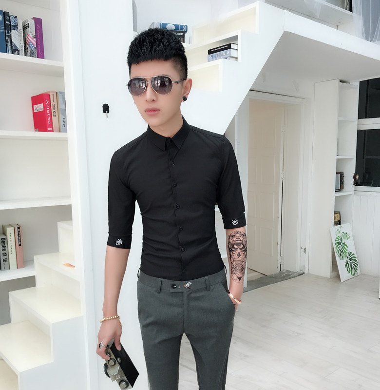 Summer short-sleeved shirt men's slim embroidery mid-sleeve inch shirt men's trendy handsome nightclub five-point sleeve shirt men's hair stylist