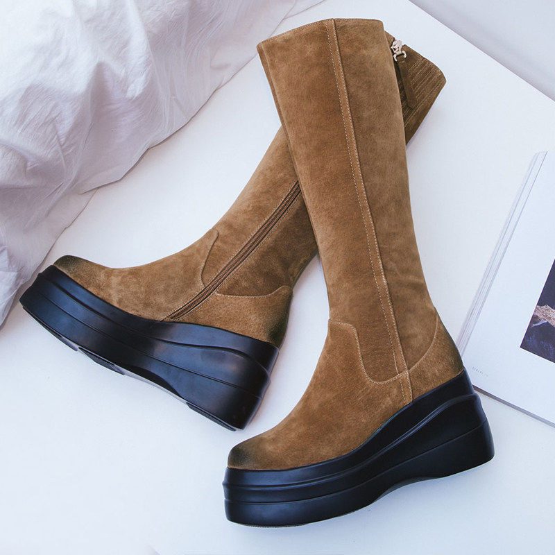High boots women's thick bottom 2022 autumn and winter leather side zipper sponge cake mid-boots Europe and the United States high-heeled Martin boots riding boots