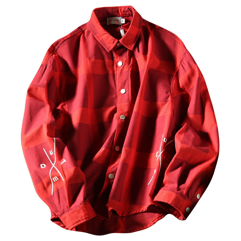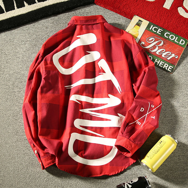 "Red Square" Korean version Leisure tide Male Loose Plaid Shirt Day Department Retro Teenagers Printed collar jacket Autumn