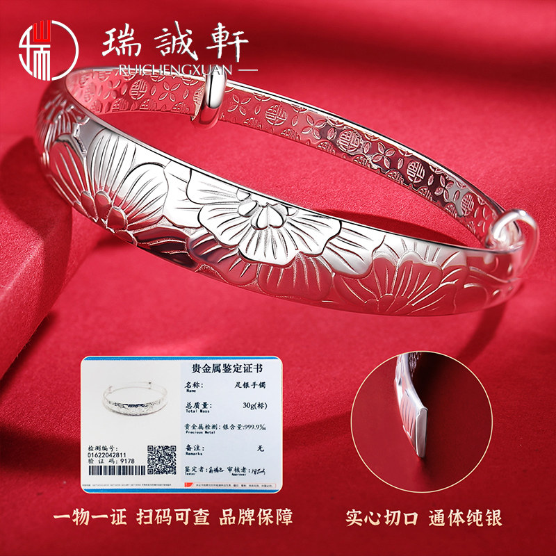 9999 pure silver flower open rich and expensive push-pull silver bracelet for about 30 gr with certificate