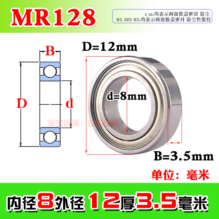 Open MR128 (8*12*.2.5 mm) MR128ZZ (8*12*.3.5 mm) Boutique GRADE MR128ZZ (8*12*.3.5 mm) Model Inner Diameter *Outer Diameter * Thickness Unit Mm Other specifications Please consult customer service