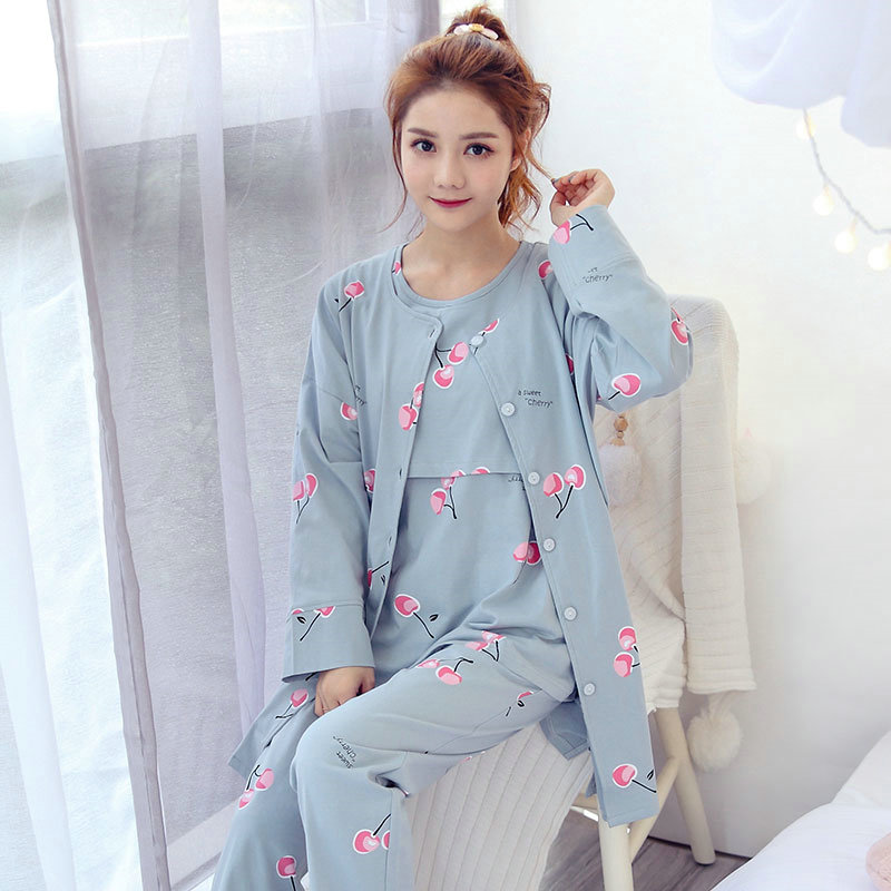 Spring and autumn long-sleeved three-piece confinement clothes pajamas women's summer thin cotton short-sleeved pregnant women postpartum nursing home clothes