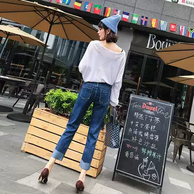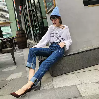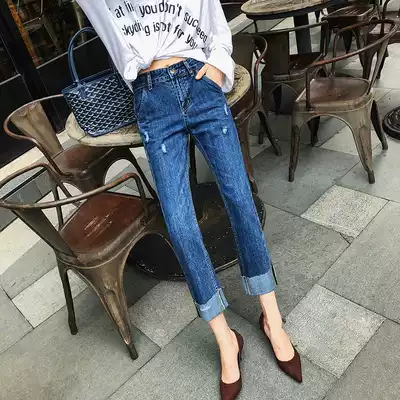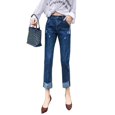 Break hole jeans women loose 2021 new spring and autumn high waist curl small man eight wide legs nine straight pants