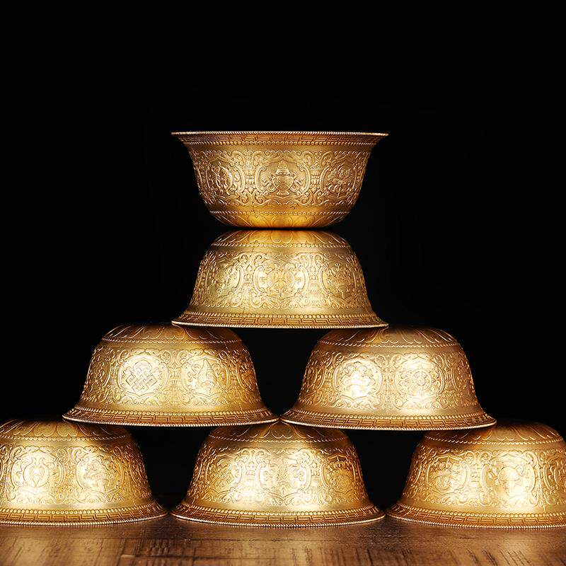 Tibetan Buddhist supplies Tibetan pure bronze carved gilded eight auspicious seven water supply bowl eight for holy water cup 10cm7 pieces