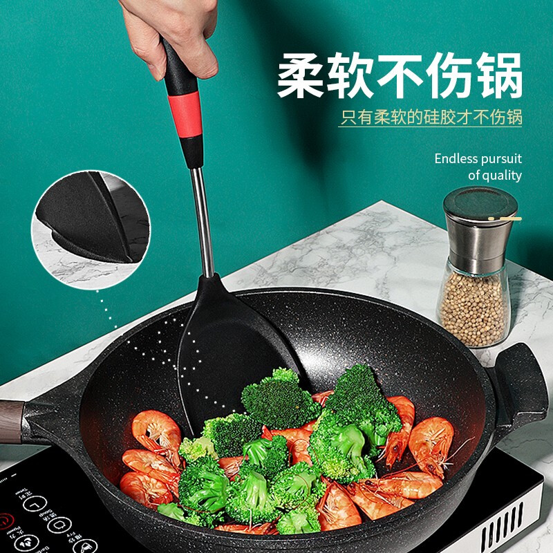 Silicone frying shovel-full steel handle full silicone pan shovel-black silicone pan shovel-full steel handle silicone soup spoon-full steel handle silicone pan shovel three-load-all-steel handle red dot silicone leakage spoon-black