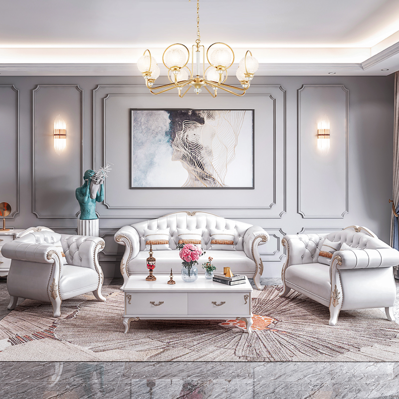 European leather sofa white carved small family leather sofa light luxury simple living room solid wood sofa combination