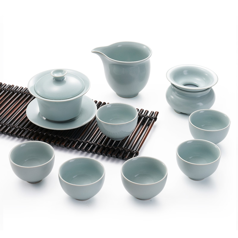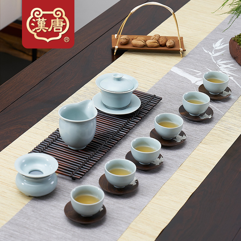 Hantang Handmade Ru Kiln Tea Set set to raise open sheet Home Gongfu Tea furniture Ceramic Whole Set Cover Bowl 10 pieces set