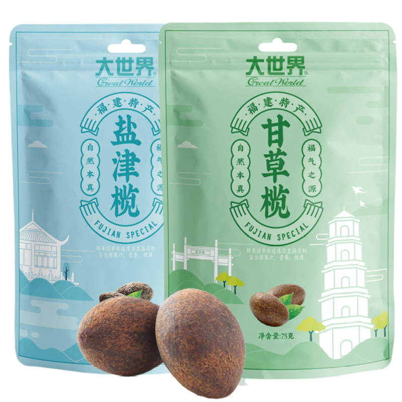 Fujian specialty Big World olives Green olives Candied fruit dried old taste Cuobian nostalgic snacks 75g*2 packs