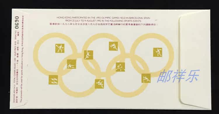 Hong Kong 1992 Summer Olympics First Day Cover Issued by the Hong Kong Olympic Committee