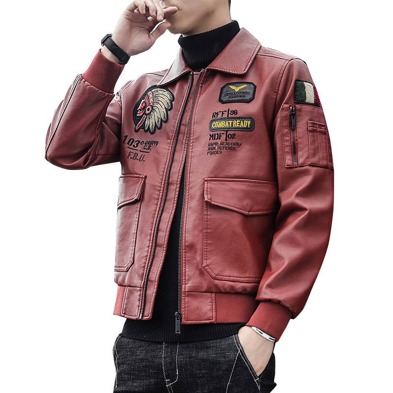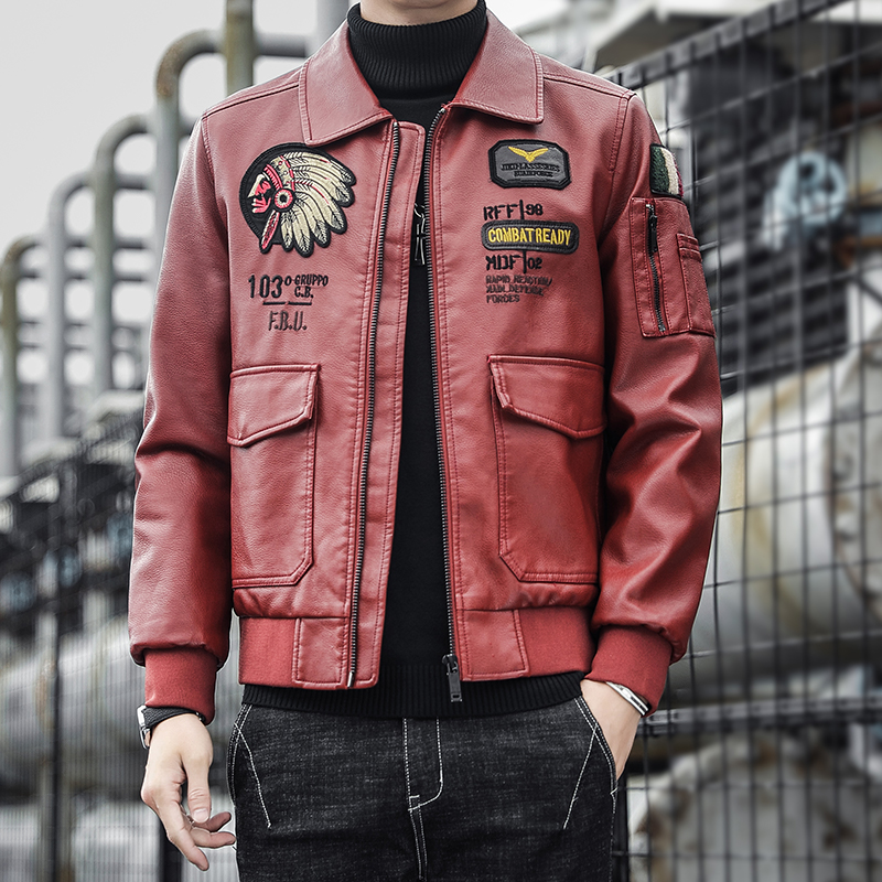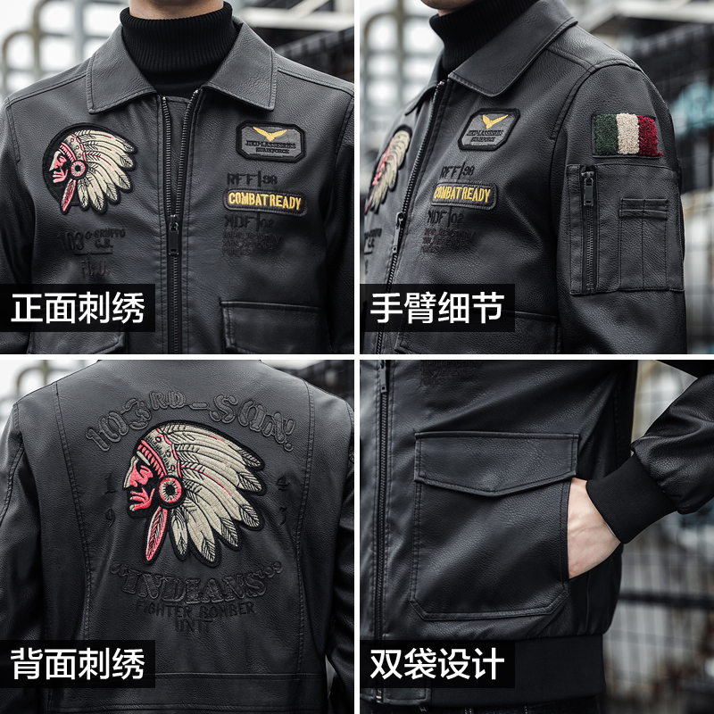 Spring and autumn season leather jacket men's locomotive clothes Korean version turned over embroidery trendsetters Imitation Leather Clothes Men's Coat-Taobao