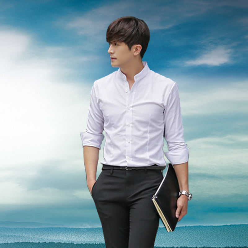 Standing Collar Shirt Male Youth Han Version Sashimi Cotton Free Ironing Suit Beating Bottom Zhongshan Dress Matching Round Collar Men's Shirt Long Sleeves