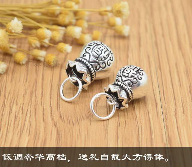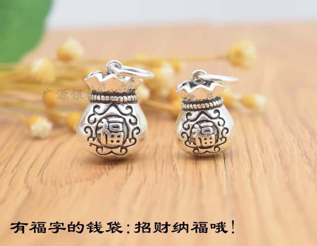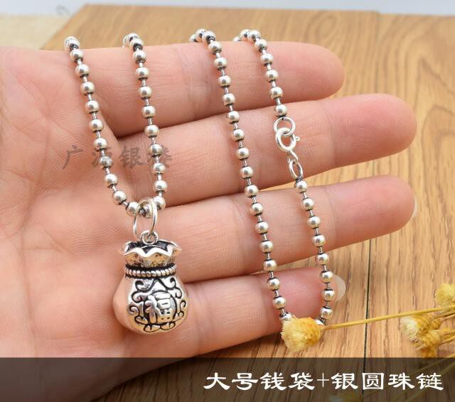 S925 pure silver foe bag pendant necklace made of old make black ethnic wind hand handmade fu character money bag round pearl silver decorated with female baby