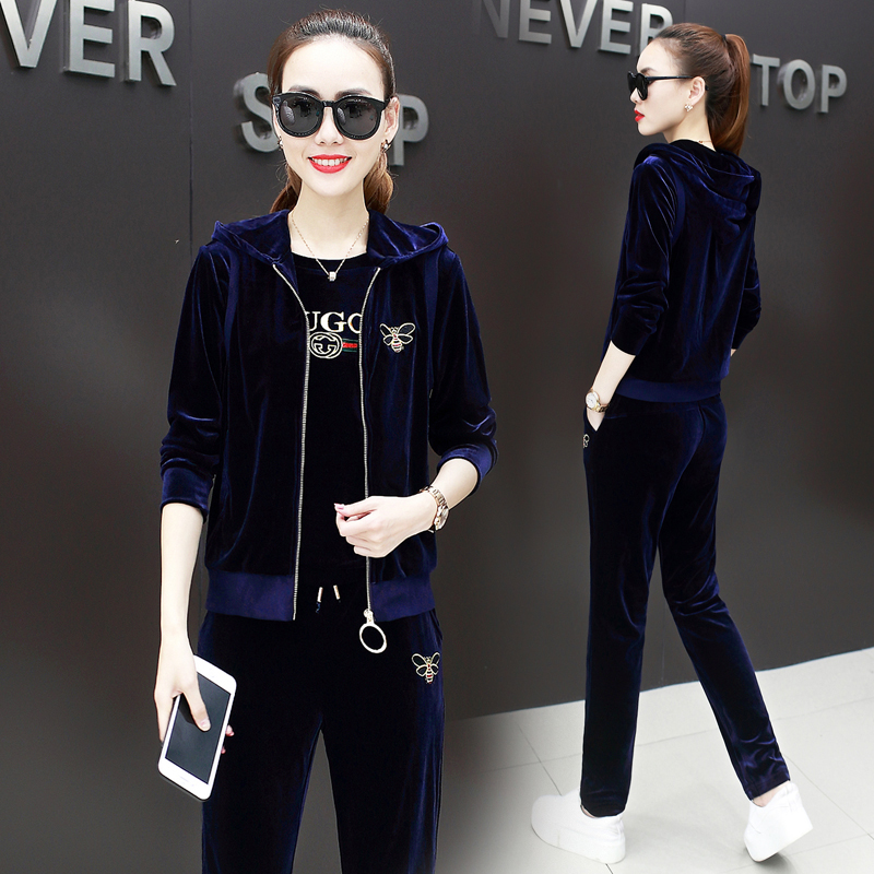 Gold velvet sportswear suit women's spring and autumn Korean version fashion display slim sweatshirt three sets casual suit women's clothing autumn clothing