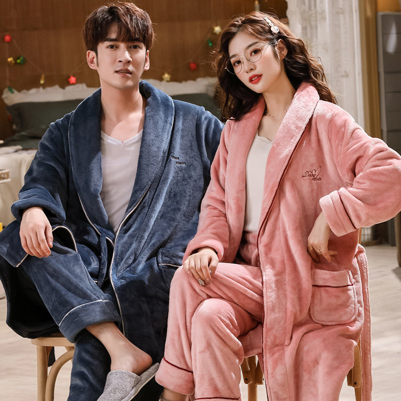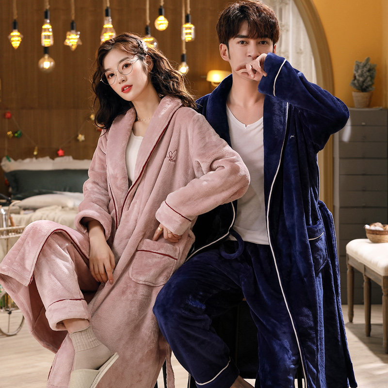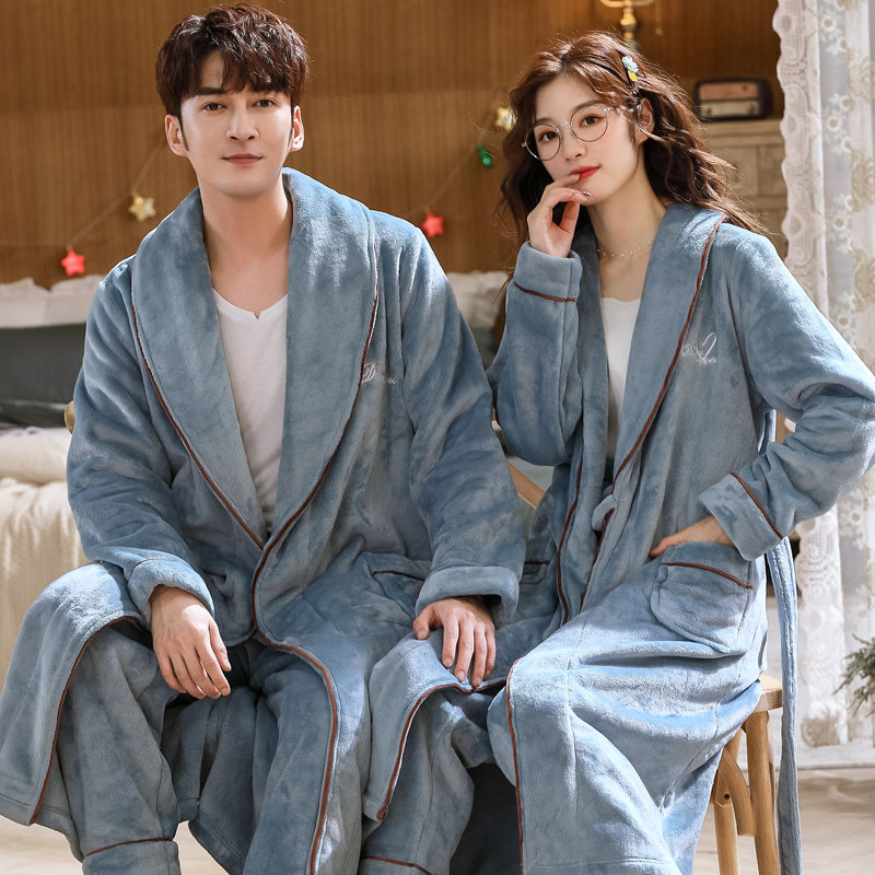 Nightgown Men's autumn and winter coral velvet couple pajamas thickened flannel bathrobe Women's long version of the morning robe large size home clothes