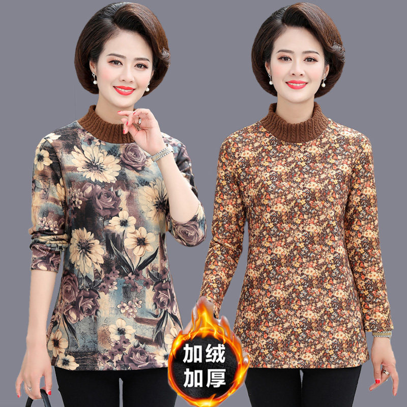 Middle-aged women's clothing autumn and winter velvet suit mother's large size semi-high collar medium and long version thickened base shirt warm clothes