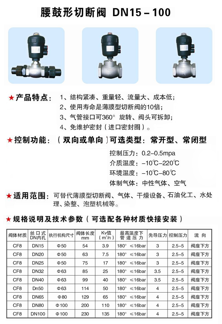DN15DN20DN25DN32DN40DN50DN65 Default valve body material 304 PTFE Default reporting price single action actuator often closed Other requirements Please