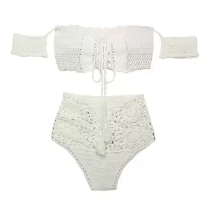 Net red hand-knitted shoulder hollow bikini sexy Lotus Leaf sleeve two-piece swimsuit women