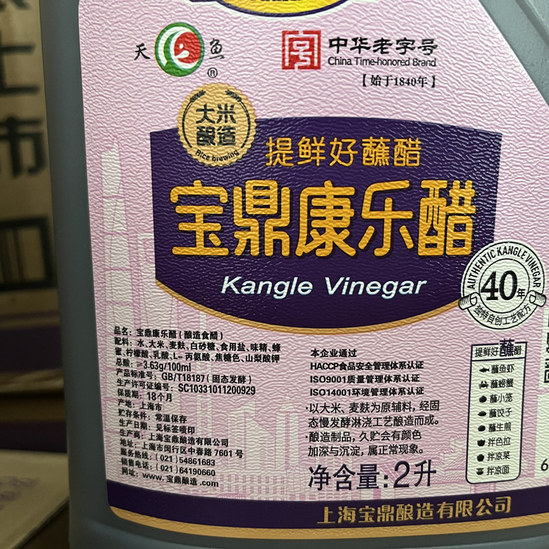 Shanghai Baoding Tianjin Kangle vinegar 2L*6 barrels of steamed dumplings dipped in vinegar crab and vinegar with cool cooking and seasoning sweet vinegar