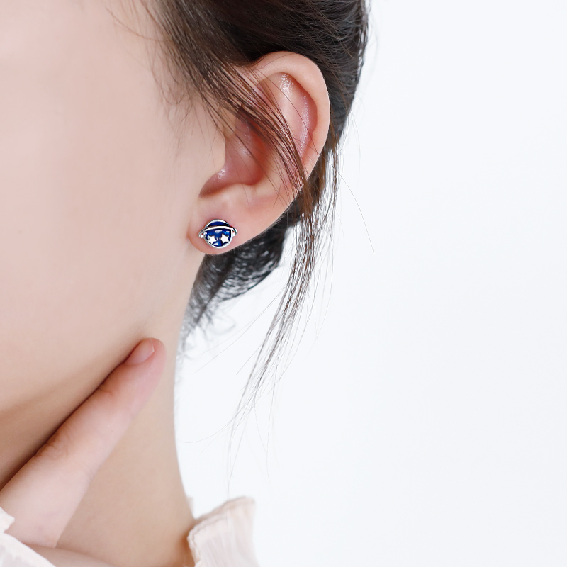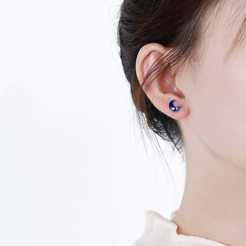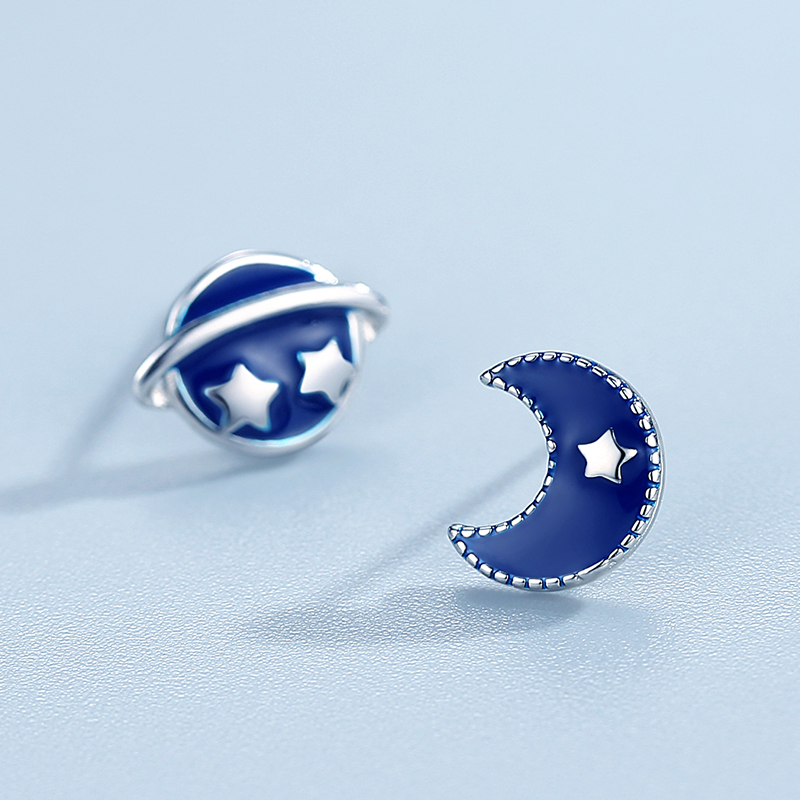 925 Pure Silver Blue Moon Small Universe Planet Earpin Girl AsymSaturn Earrings Starry Sky Personality Earrings