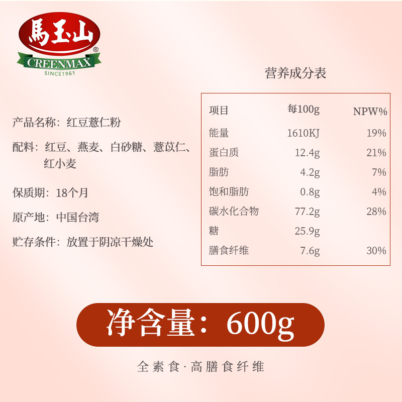 Ma Shan Red Bean Pearl Barley Flour 600g Dai Meal Five Valley Powder Satiety That Is Flush Food Taiwan Imported Red Bean Pearl Barley Powder