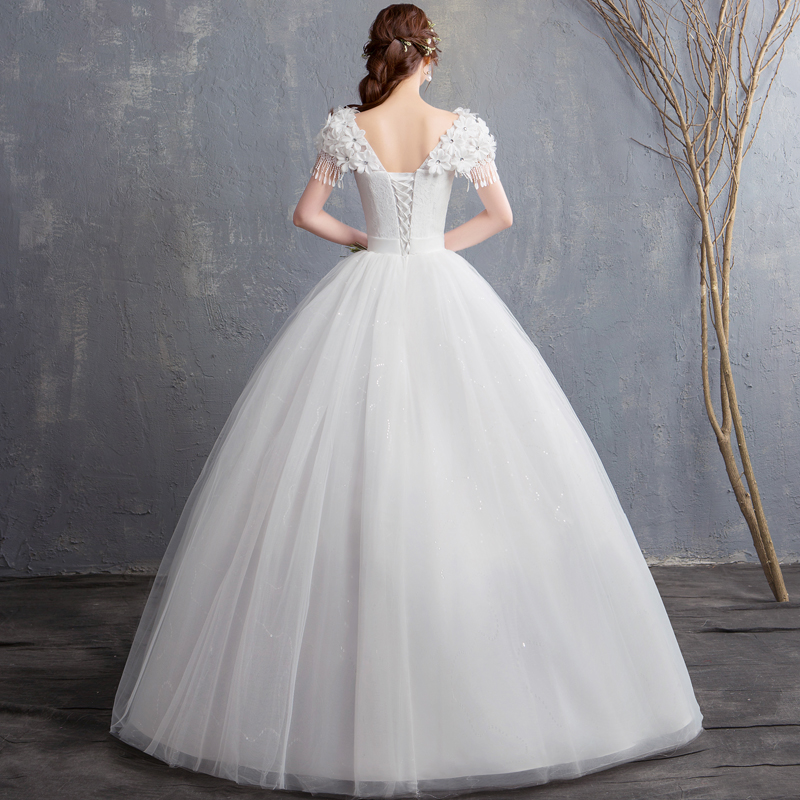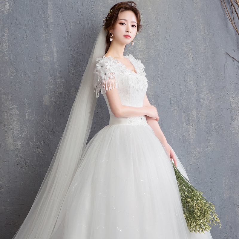 Light wedding dress bride 2021 new temperament word shoulder Korean thin simple princess fantasy Qi flowers