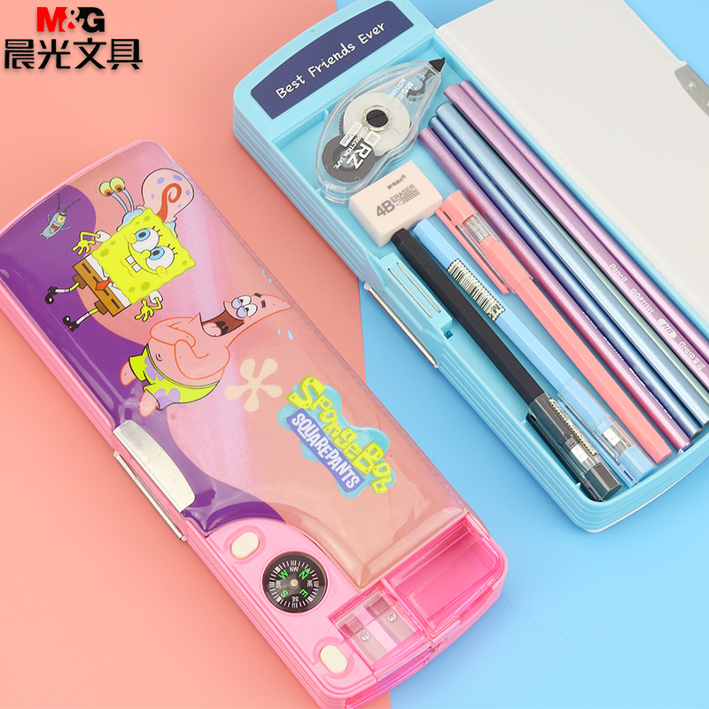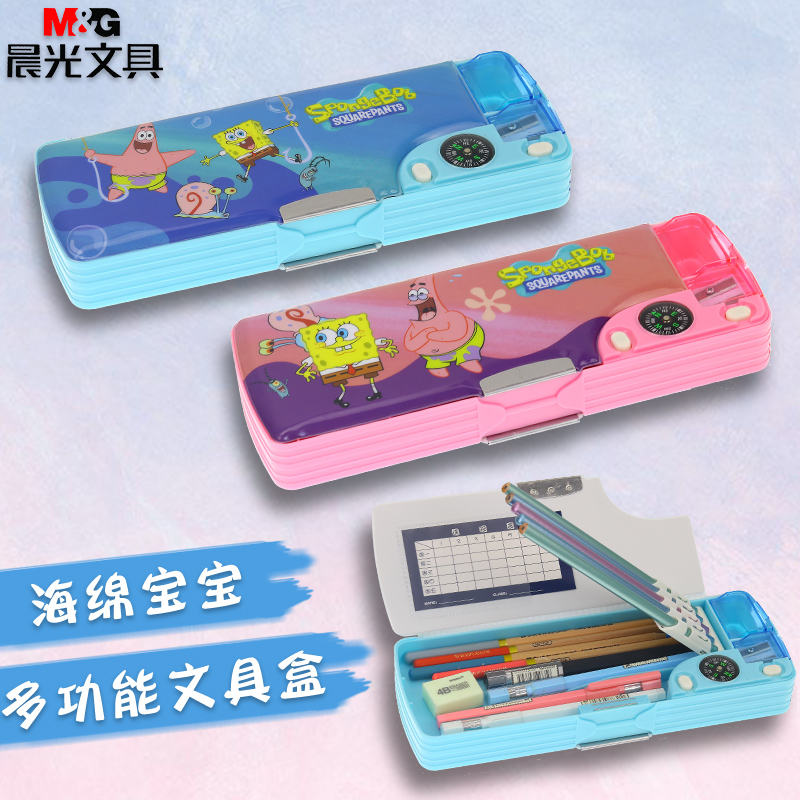 Morning light Spongebob multi-function stationery box male primary school students double switch double net red pencil box Korean version of the girl simple pen box Kindergarten children 1-3 grade cute cartoon large capacity
