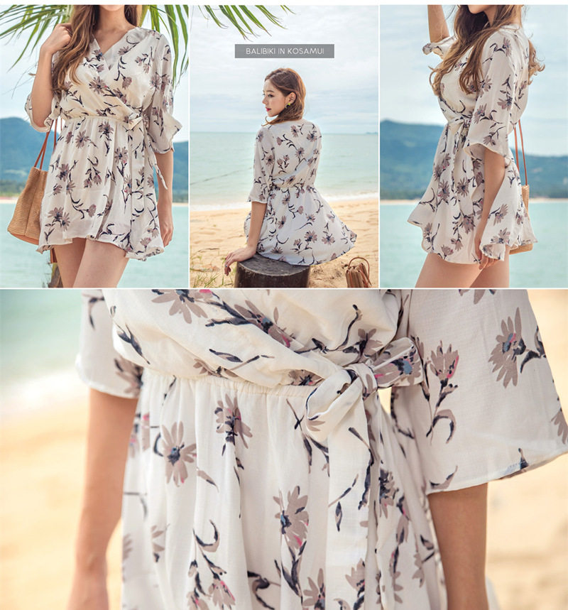 South Korea's new white shorts High waist V collar A character dress with sleeves sunscreen cotton numb and a little fresh and lean ocean dress