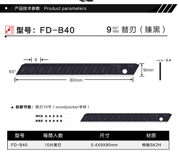 Woodpecker FD-B40 utility blade small 9mm all black blade wallpaper wallpaper cutting paper small blade imported material
