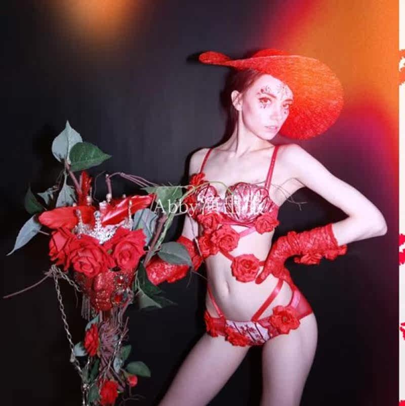 Nightclub Bar Rose Flowers Bikini Suit Sexy DsGOGO Valentine's Day Party Wet with Watch Costume
