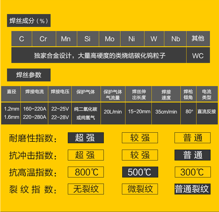 YD798 wear-resistant welding wire YD998 wear-resistant welding wire YD212 wear-resistant welding wire YD688 wear-resistant welding wire YD788 wear-resistant welding wire YD397 wear-resistant welding wire YD888 wear-resistant welding wire YD517 wear-resistant welding wire YD507Mo high-alloy wear-resistant welding wire YD256 wear-resistant welding wire High carbide alloy welding wire Other models message or contact customer service YD818 wear-resistant crack-resistant welding wire YD856 impact-resistant wear-resistant welding wire