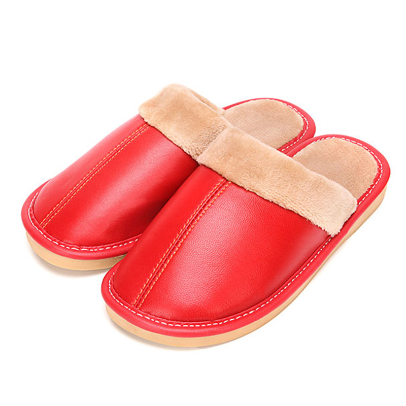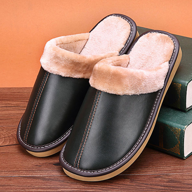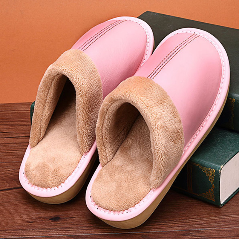 Genuine leather slippers men's cotton slippers female winter home cotton sheepskin indoor couple non-slip warm wood floor fur home