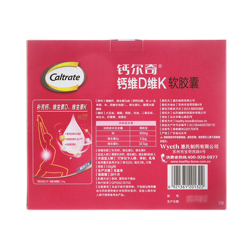 Calcium carbonate, vitamin D3 oil (cholecalciferol DL-α-tocopherol, capric glycerol), vitamin K1 casein phosphopeptide, soybean oil, phospholipid gelatin, glycerol, titanium dioxide purified water, citric yellow seductive red