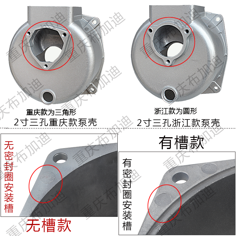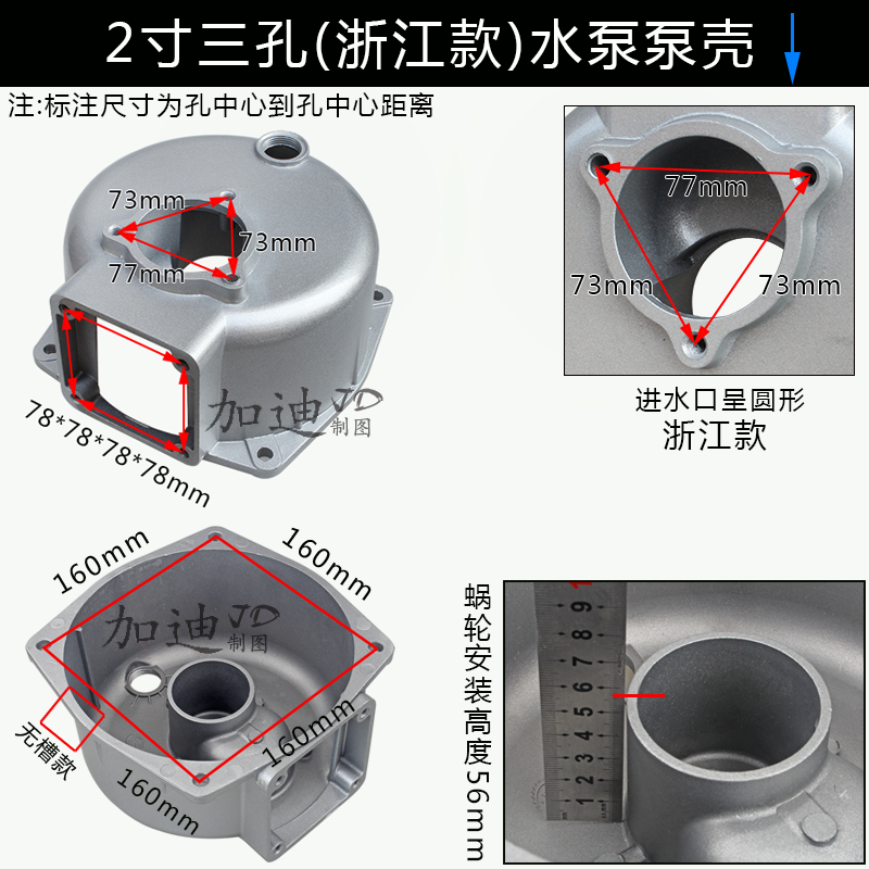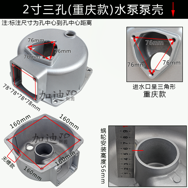 2 inch three-hole pump housing (Chongqing model) 2 inch three-hole water pump housing (Zhejiang model) 2 inch four-hole water pump shell 3 inch slot (unequal parts) pump pump shell 3 inch grooveless model (equal minutes) pump case 3 inch grooveless model (unequal minutes) pump pump shell 2 inch high head (single impeller) pump case 2 inch high head (double impeller) pump pump shell 170F (small 4 inches) grooved pump case 4 inch slot pump case