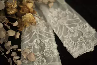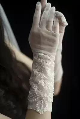Ji design Bride wedding lace bead mesh gloves medium and long version of stitched beads fine mesh gauze slim wedding gloves