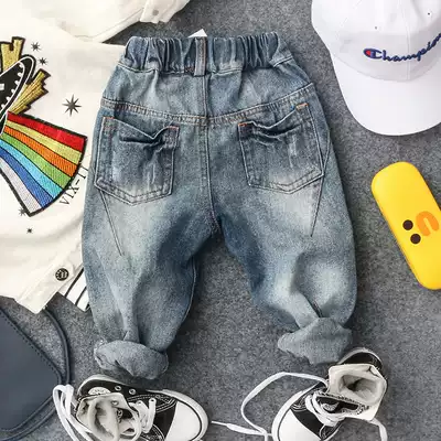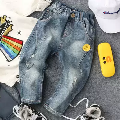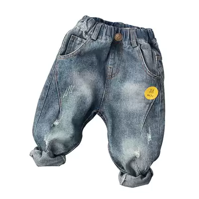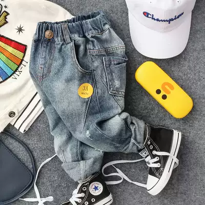 Spring and autumn new boys and girls Baby R-shaped buckle hole jeans tide boy pipe pants denim blue trousers