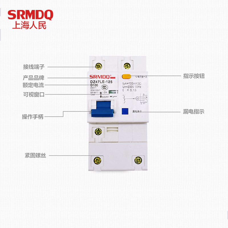 Shanghai People's DZ47LE-125 three-phase four-wire leakage circuit breaker 1P 2P 3P N100A125A high power