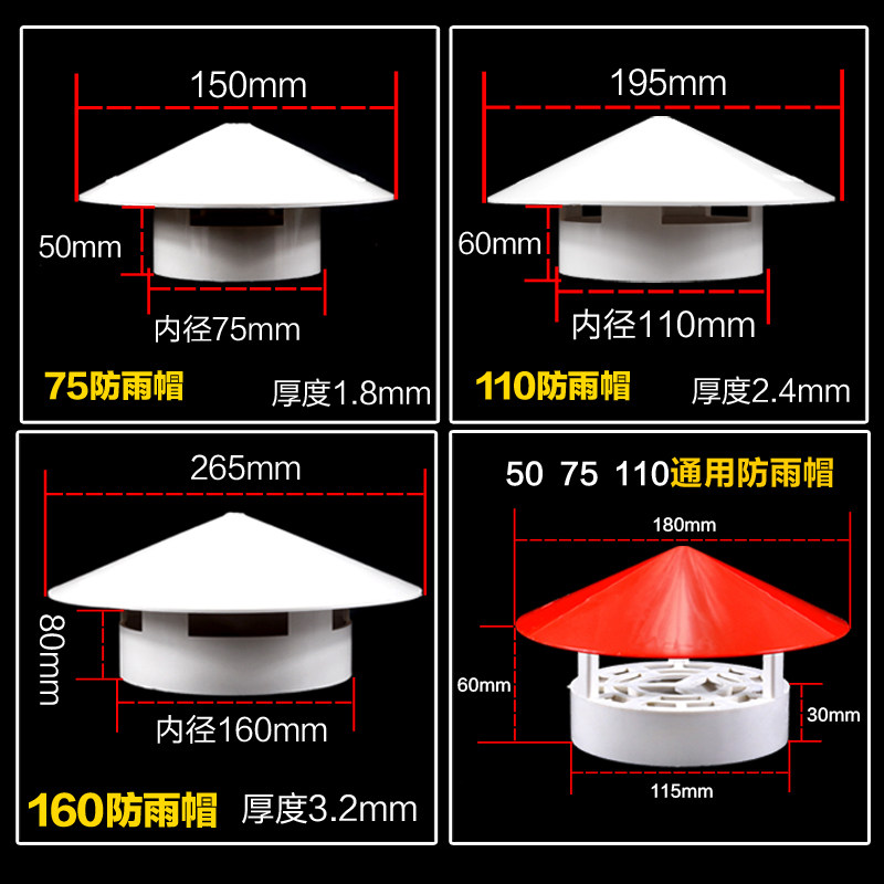 GB Rain Cap 75 Integrated Molding GB Rain Cap 110 One Piece Molding GB Rain Cap 160 One Piece Molding 200 Rain Cap Integrated Molding 160-200 General Rain Cap White Top 50-75-110 Universal Rain Cap (Red Top) 110-160 Universal Rain Cap (Red Top) 160-200-200 General Rain Cap Red Top 75 Ventilation Hat 110 Ventilation Hat 160 Ventilation Hat