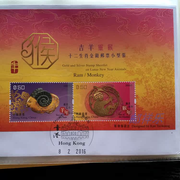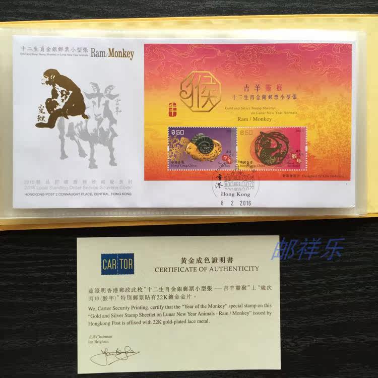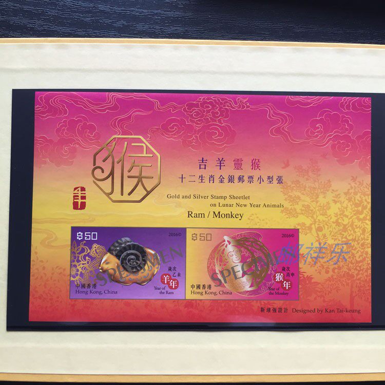 Hong Kong 2016 Auspicious Sheep Spirit Monkey-Twelve Zodiac Gold and Silver Stamp Miniature Sheet Commemorative Cover Set with sample